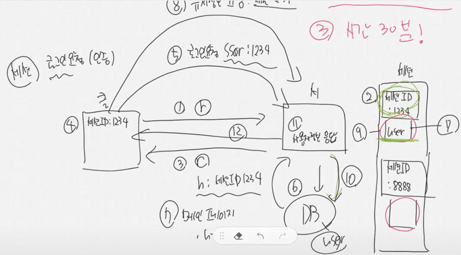 처음 웹에서 서버로 어떤 요청을 보낼때 서버에서는 웹에 html을 보내면서 http의 header에 쿠키를 담아 보낸다. 이때 쿠키에 세션ID를 담는다. 그 다음 같은 요청을 보낼때는 받은 세션ID를 요청에 담아 보내서 처음 보내는 요청이 아님을 알린다. 이때 세션ID를 다른 사람이 가져가면 막기 위해 자체 목록에 방문자 카드를 만들어서 담아둔다.(세션에 세션값을 담는다) 그러면서 최초요청에 대해 header에 쿠키를 담아 보내면서 새 방문자 카드도 같이 header에 담는다.