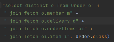 기존의 버전3의 페치조인에서와 같이 코드를 짜는 대신, orderItmes와 items 엔티티도 같이 페치조인을 한다. 거기에 추가적으로 distinct를 통해 중복을 제거해준다.