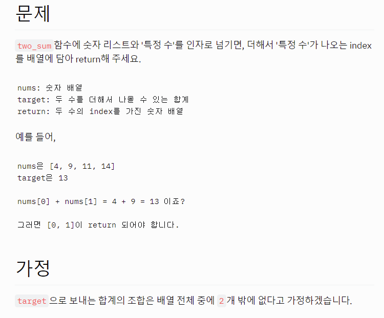 def two_sum(nums, target): # 아래 코드를 작성해주세요. length = len(nums) #변수에 파라미터로 넘겨받은 리스트의 길이를 저장 for i in range(length): # 0 < 리스트 길이동안 반복 (0 1 2 3) for j in range(i+1, length): # i+1 < 리스트 길이동안 반복(1 2 3) if (nums[i]+nums[j]) == target: #리스트에서 2개의 값을 합해서 target과 비교 result = list(map(int, [i,j]))#list(map())를 통해 [i,j]리스트를 result에 저장한다. return result # 결과값 리턴 nums = [4,9,11,14] target = 13 print(two_sum(nums,target))