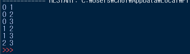 def two_sum(nums, target): # 아래 코드를 작성해주세요. length = len(nums) #변수에 파라미터로 넘겨받은 리스트의 길이를 저장 for i in range(length): # 0 < 리스트 길이동안 반복 (0 1 2 3) for j in range(i+1, length): # i+1 < 리스트 길이동안 반복(1 2 3) print(i,j)
