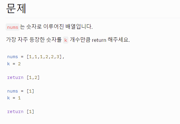 def more_than_half(nums): dic = {} # 빈 딕셔너리 변수 선언 result = [] for i in nums: if i not in dic: # i가 nums안에 없으면 dic[i] = 1 # dic의 키 i 에 value 1 저장 else: #i가 nums안에 있으면 dic[i] += 1 # dic의 키 i의 value에 1 더하기 for i in range(k): dic_max = max(dic.keys() , key= dic.get) #dic에서 가장 큰 value값의 키값 result.append(key_max) del dic[key_max] return dic_max