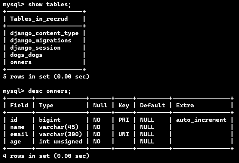 해당 테이블을 migrate하고 mysql에서 테이블을 확인해보자.
