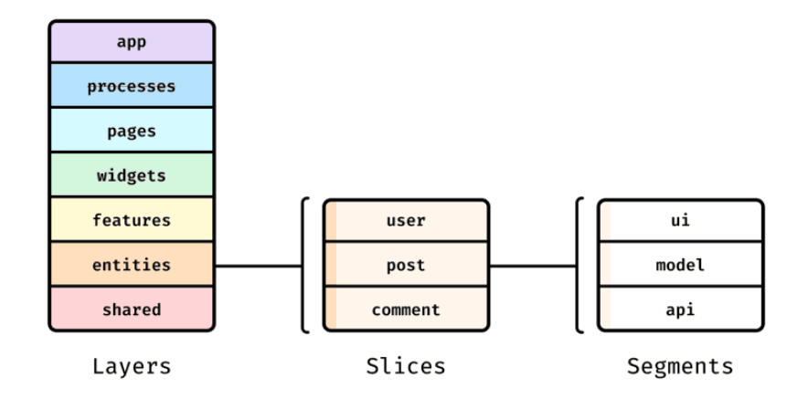 - Slices: slice는 도메인 이름으로 작성하여 비즈니스 로직을 작성할 수 있습니다. app과 shared에서는 비즈니스 로직을 작성하지 않기때문에 slice가 없습니다. slice내부에서는 segement를 가질 수 있습니다. 반드시 public api를 정의해서 필요한 것만 export하도록 합니다.