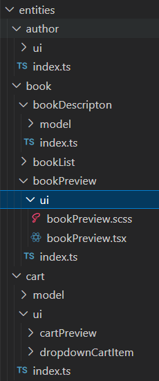 - bookstore에서는 책 저자표시(author/ui), 책 상세페이지 모델(bookDescription/model), 책 목록 모델(bookList/model), 책 미리보기(bookPreview/ui), 카트 미리보기(cartPreview/ui, model), 책 카테고리 미리보기 모델(categoryPreview/model), 테마변경 등이 있습니다.