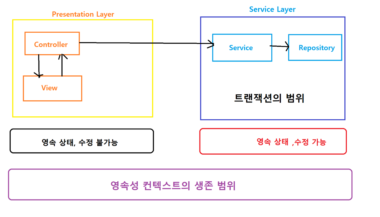 간단하게 정리하자면 OSIV 기능은 기존 트랜잭션 범위의 영속성 컨텍스트와는 달리, 트랜잭션 보다 영속성 컨텍스트의 생명 주기를 늘리는 방식이라고 할 수 있습니다. 또한 영속성 컨텍스트 종료 시점에 플러시를 호출하지 않음으로 Presentation Layer 에서 진행되는 작업은 DB에 반영되지 않습니다 👨💻