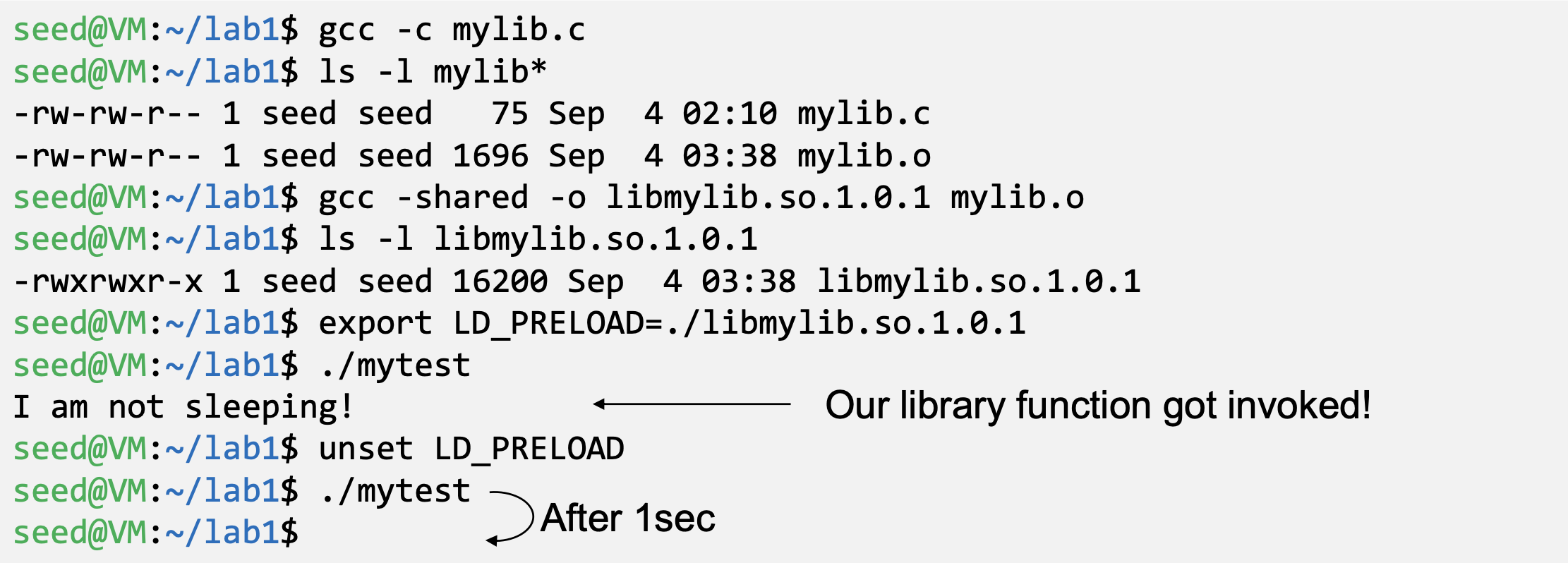 - We need to compile the above code, create a shared library and add the shared library to the LD_PRELOAD environment variable