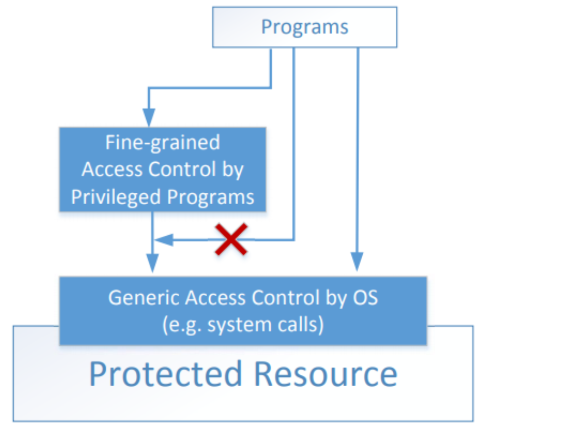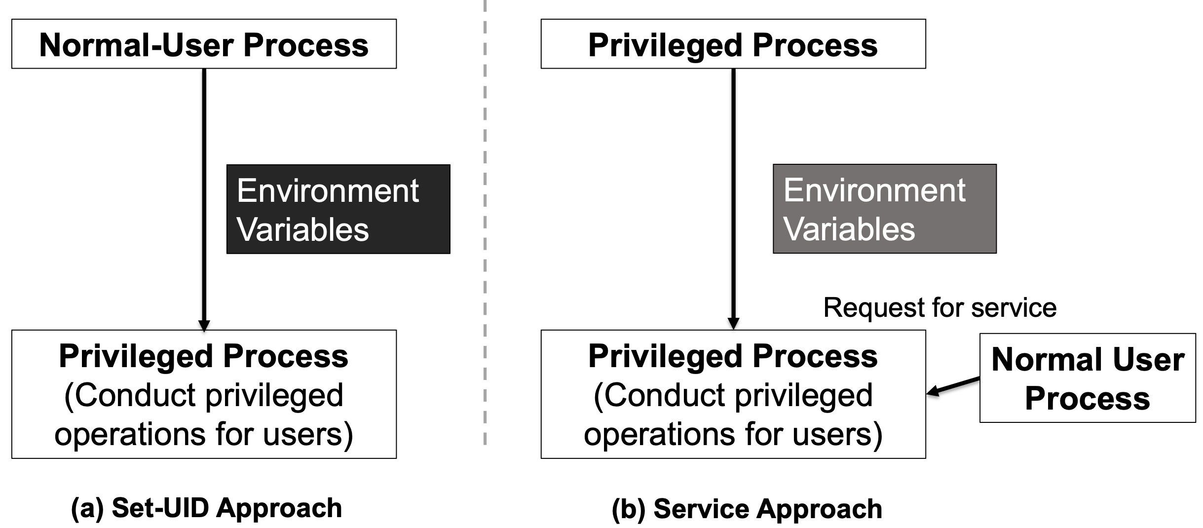 - Service approach: Normal users have to have to request a privileged service to perform the actions for them. Figure in the earlier slide depicts these two approaches
