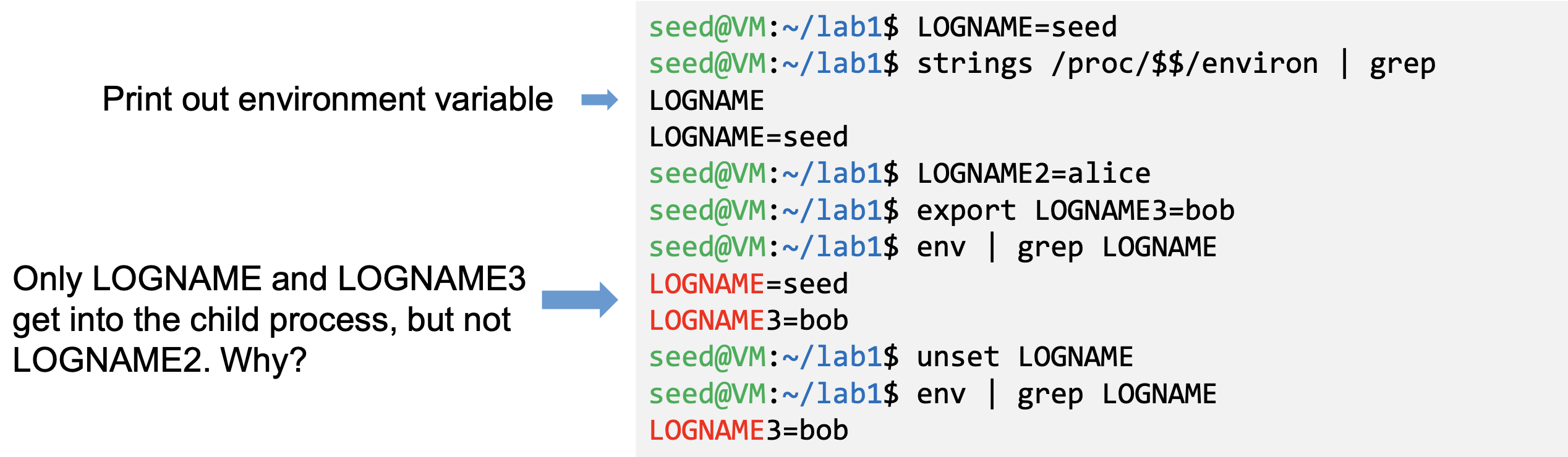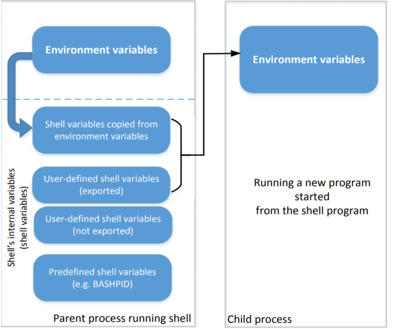 - Right shows how shell variables affect the environment variables of child processes