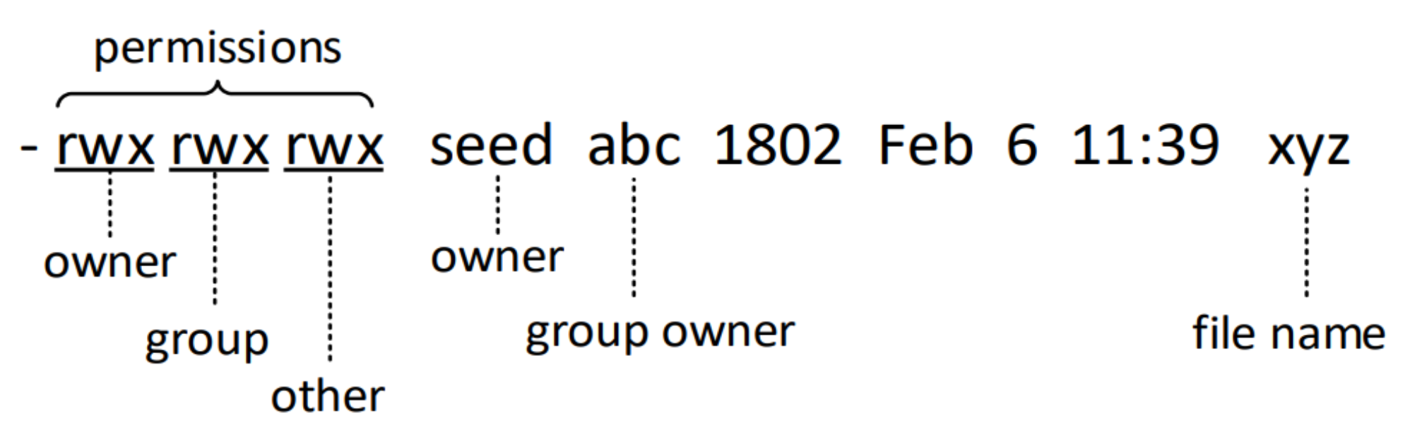 - read (r): user can list the contents of the directory (e.g., using ls)