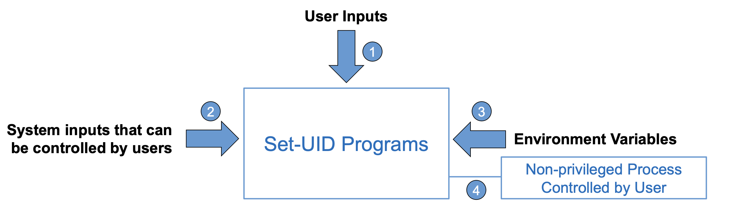 - Programs may directly use environment variables. If these are privileged programs, it may result in untrusted inputs.