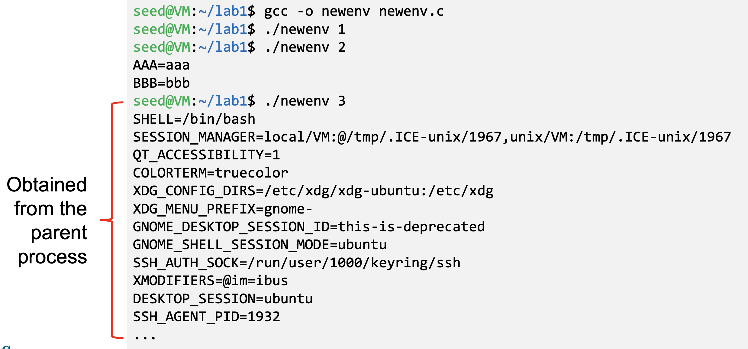 - It also shows how the parent shell’s environment variables becomes the child process’s environment variables (via shell
