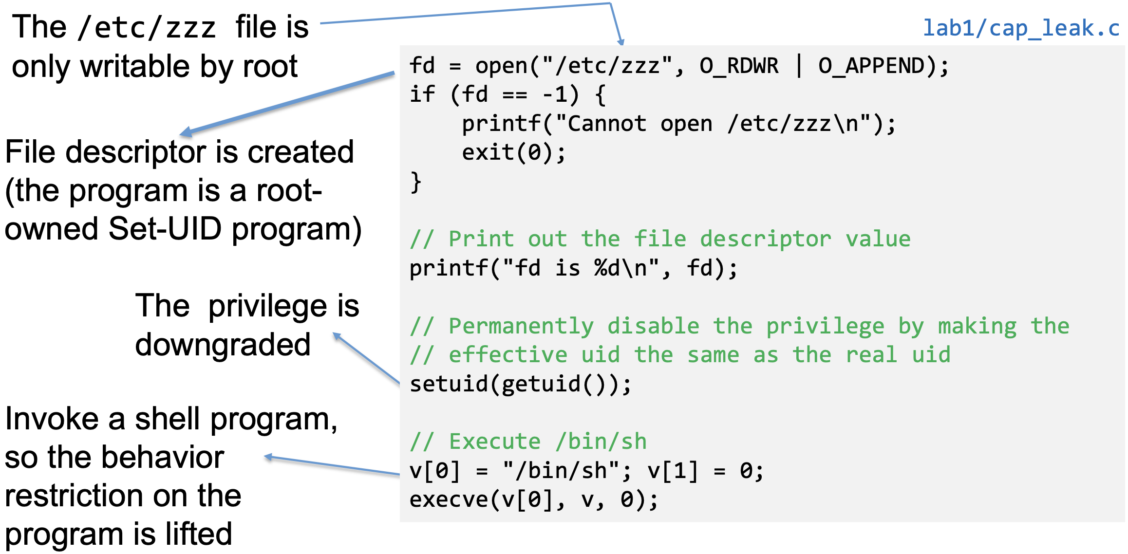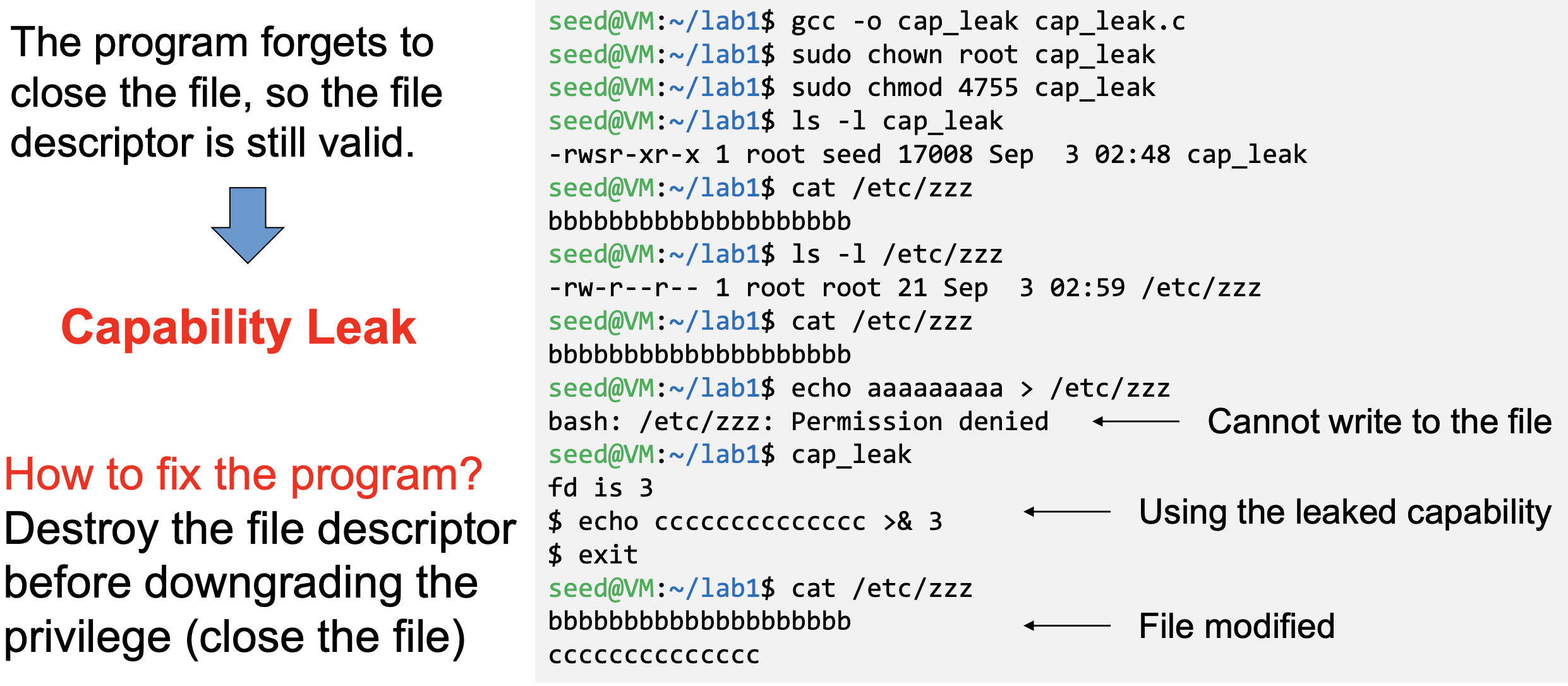 - Capability leak – file descriptor not closed