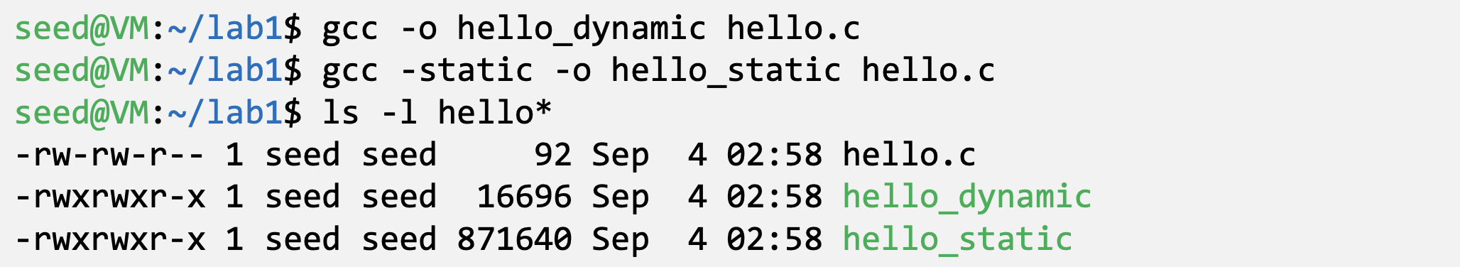 - We can notice that the size of a static compiled program is 100 times larger than a dynamic program