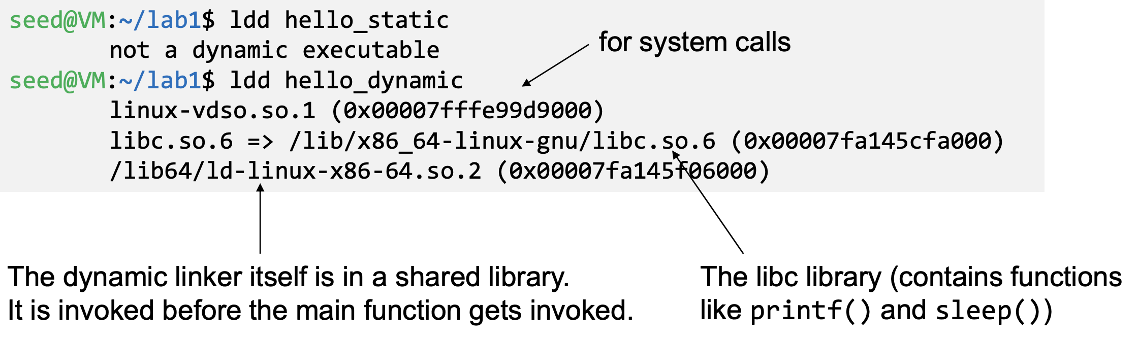 - Program calls sleep function which is dynamically linked: