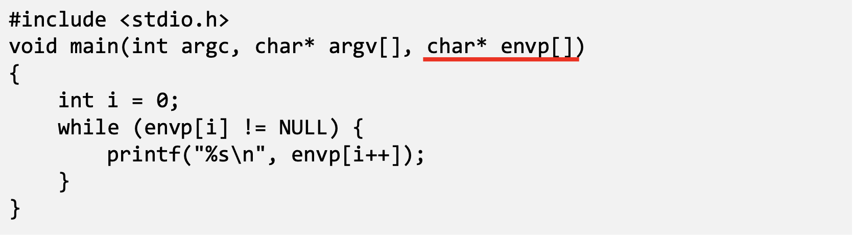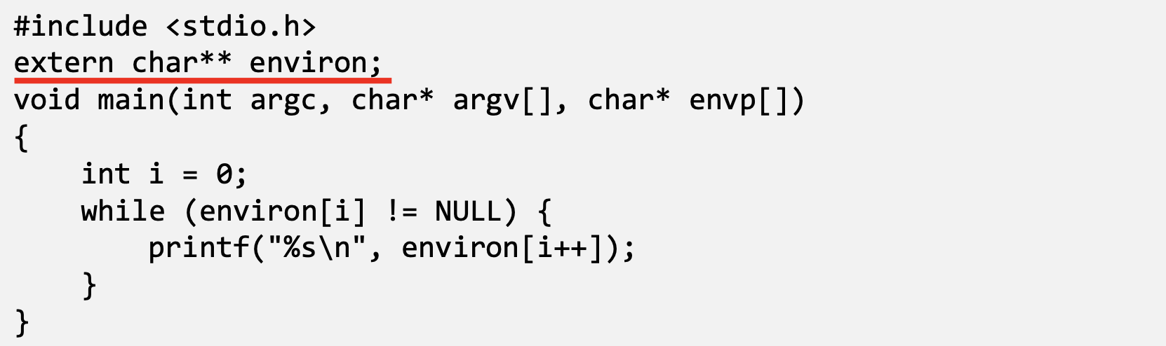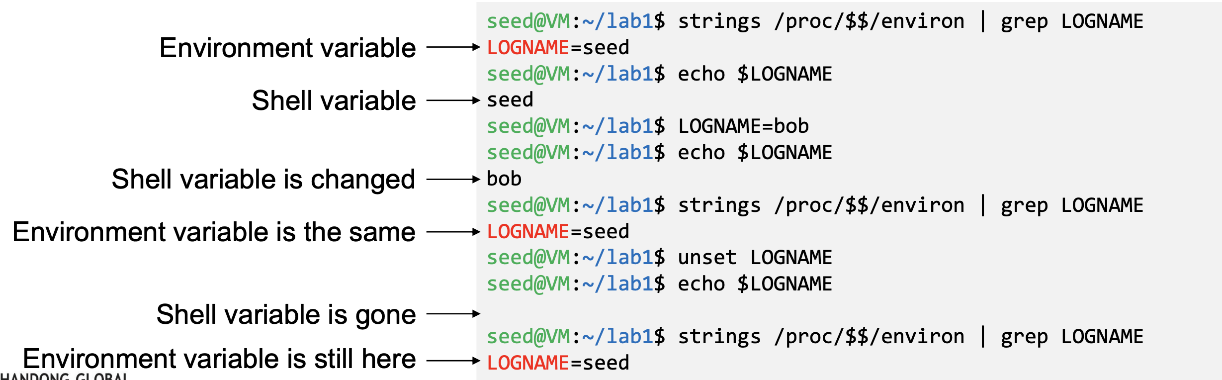 - The command “strings /proc/$$/environ” prints out the environment variable of the current process (shell will replace $$ with its own process ID)