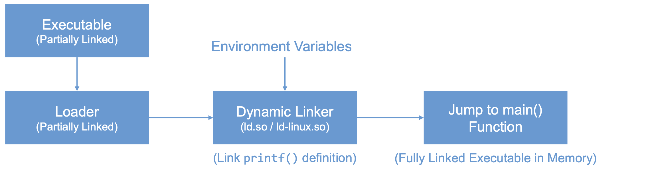 - The linker combines the program’s code and the library code containing the printf() function