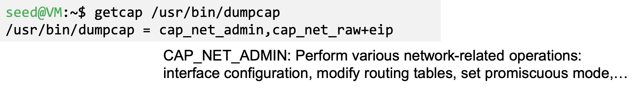 - Use “man capabilities” to find all the capabilities
