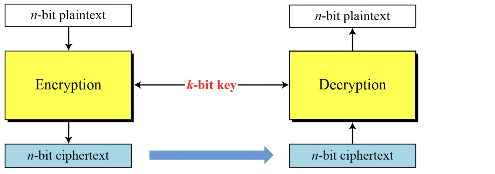 - A symmetric-key modern block cipher encrypts an n-bit block of plaintext or decrypts an n-bit block of ciphertext.