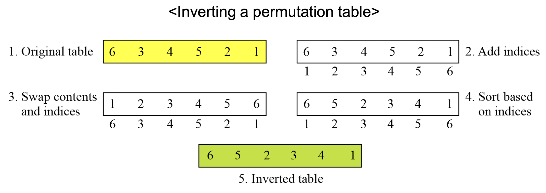 - Following figure shows how to invert a permutation table represented as a one-dimensional table.