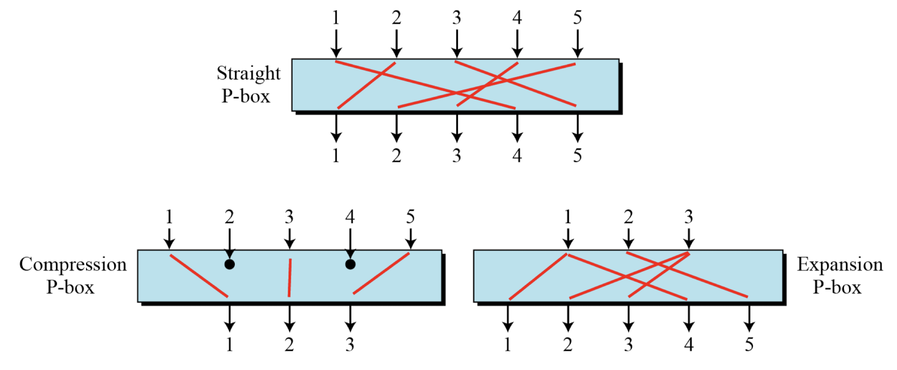 - P-Boxes: A P-box (permutation box) parallels the traditional transposition cipher for characters. It transposes bits.