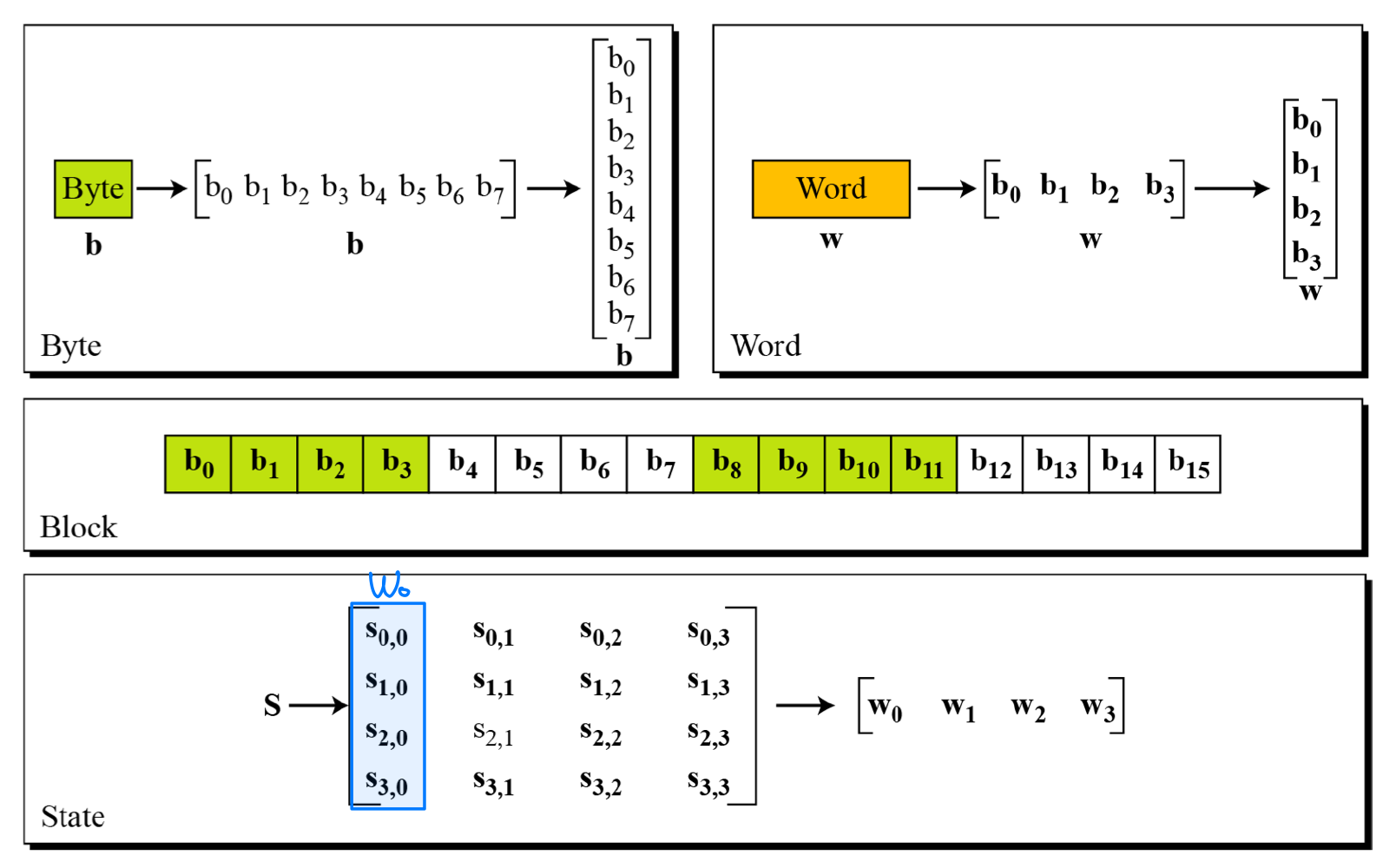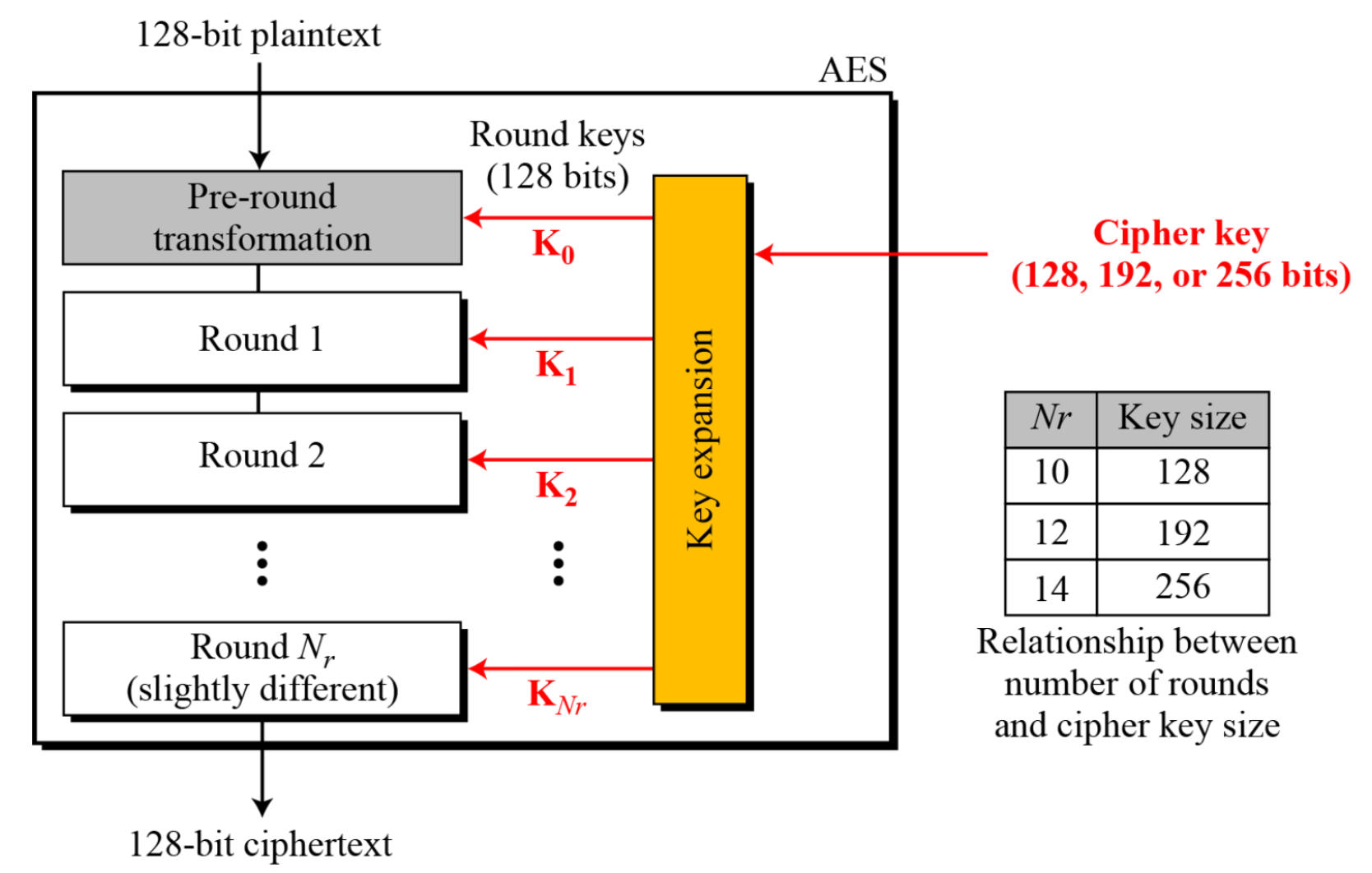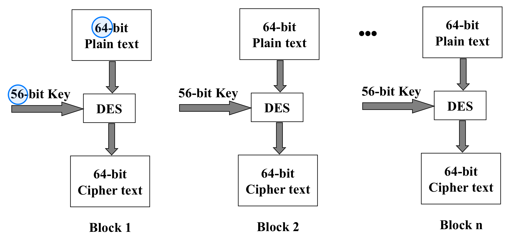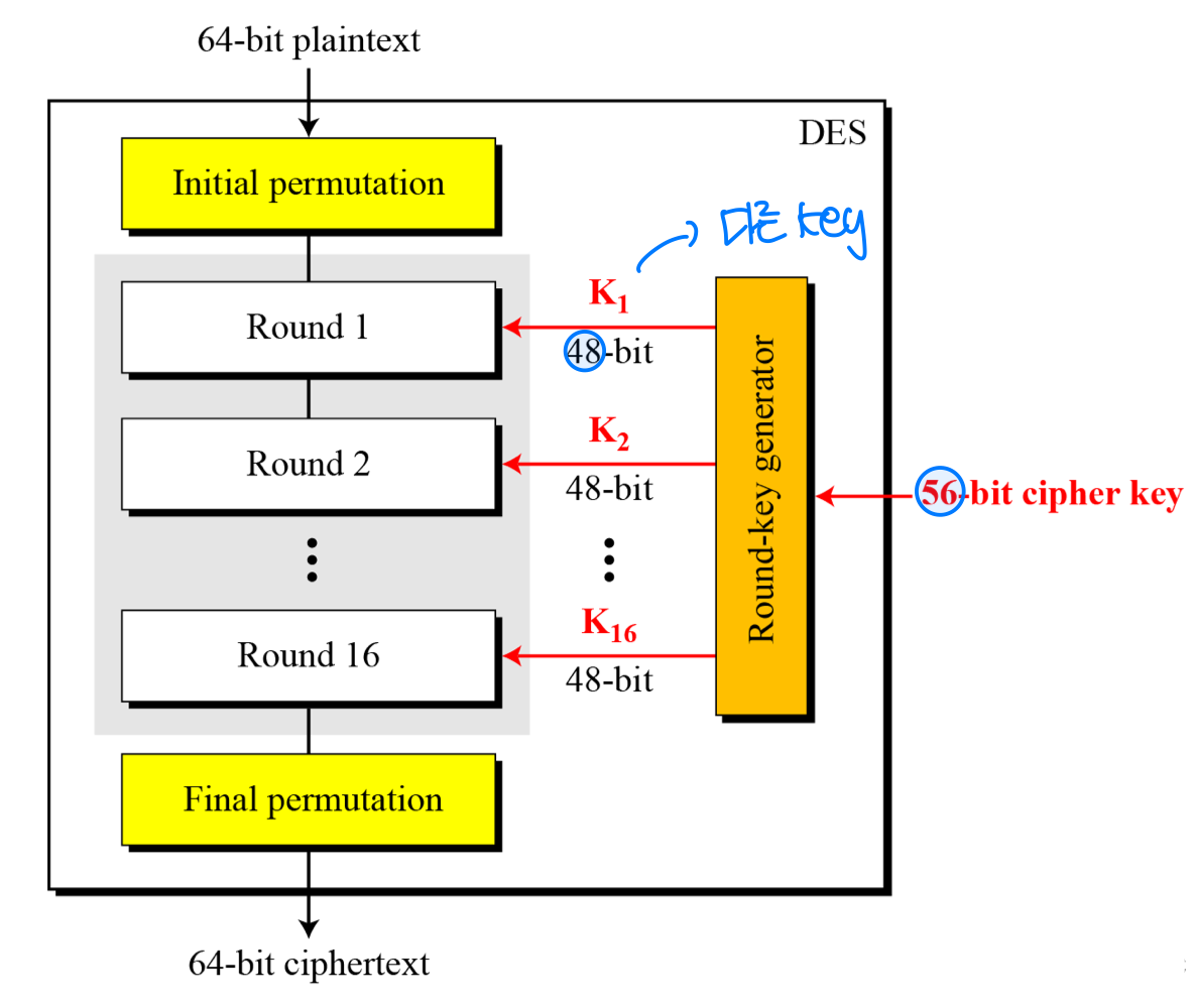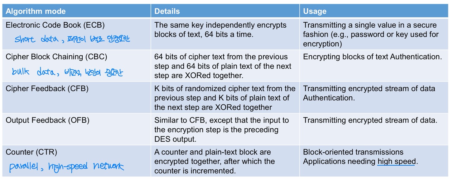 - eg. DES : 64-bit blocks, AES : 128-bit blocks
