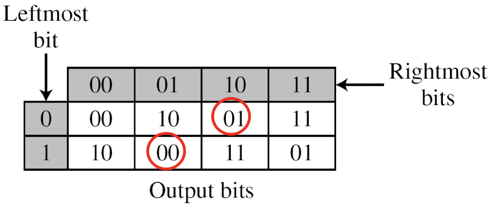 - Based on the table, an input of 010 yields the output 01. An input of 101 yields the output of 00.