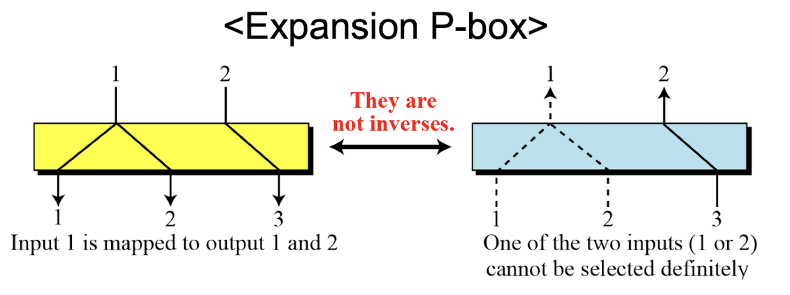 - In an expansion P-box, an input mat be mapped to more than one output during encryption, the decryption algorithm does not have a clue which of the several inputs are mapped to an output