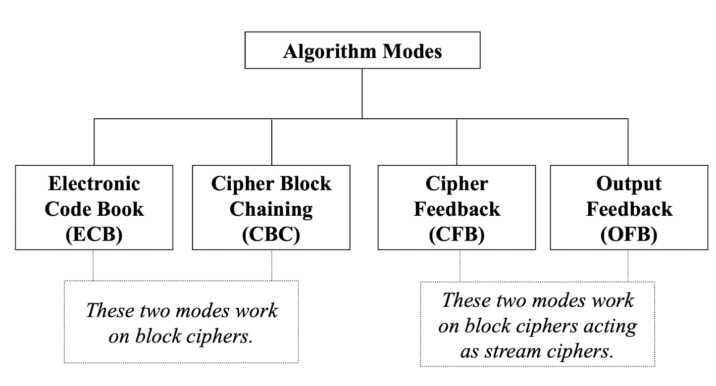 - An algorithm modes is a combination of a series of the basic algorithm steps on block cipher, and some kind of feedback from the previous step