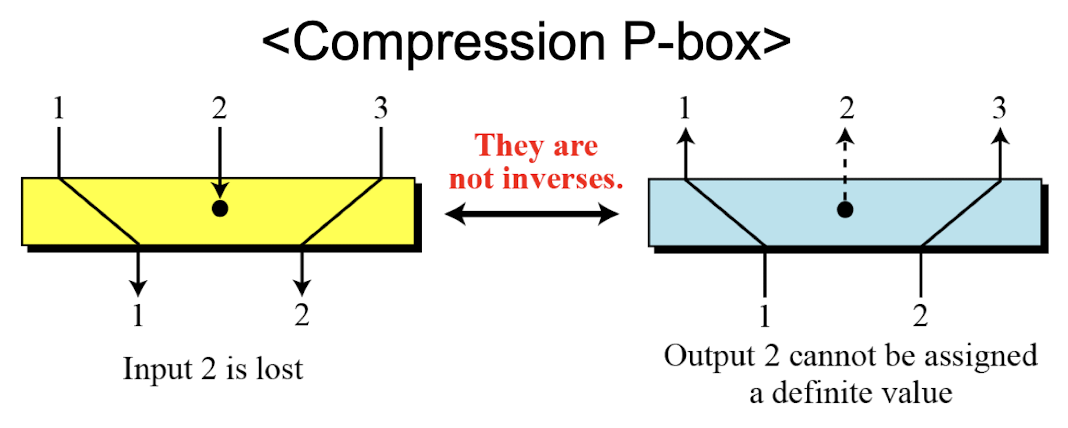 - In a compression P-box, an input can be dropped during encryption, the decryption algorithm does not have a clue how to replace the dropped bit.