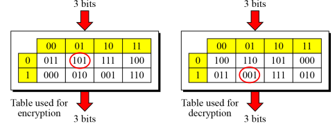- Following figure shows an example of an invertible S-box. For example, if the input to the left box is 001, the output is 101. The input 101 in the right table creates the output 001, which shows that the two tables are inverses of each other.