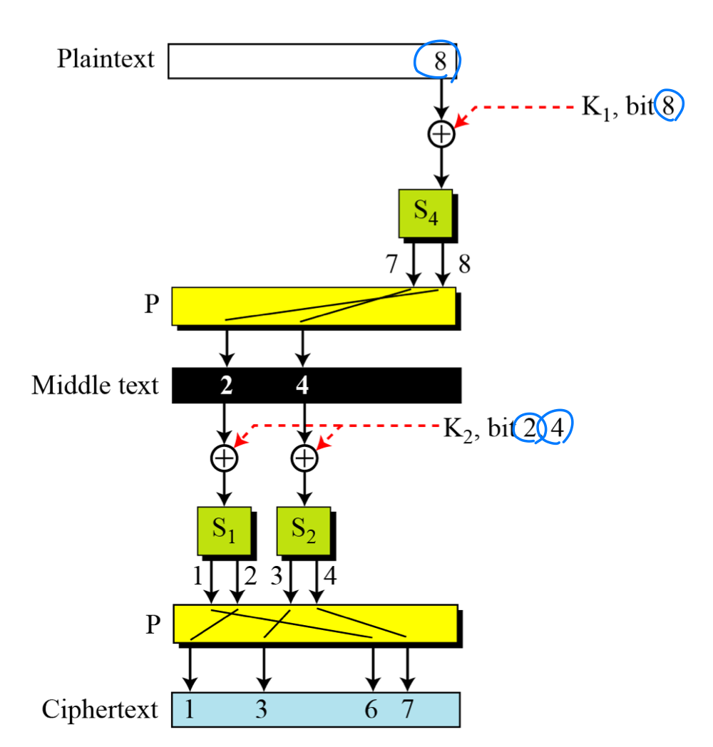 - The four bits of ciphertext, bits 1, 3, 6, and 7, are affected by three bits in the key (bit 8 in K1 and bits 2 and 4 in K2).
