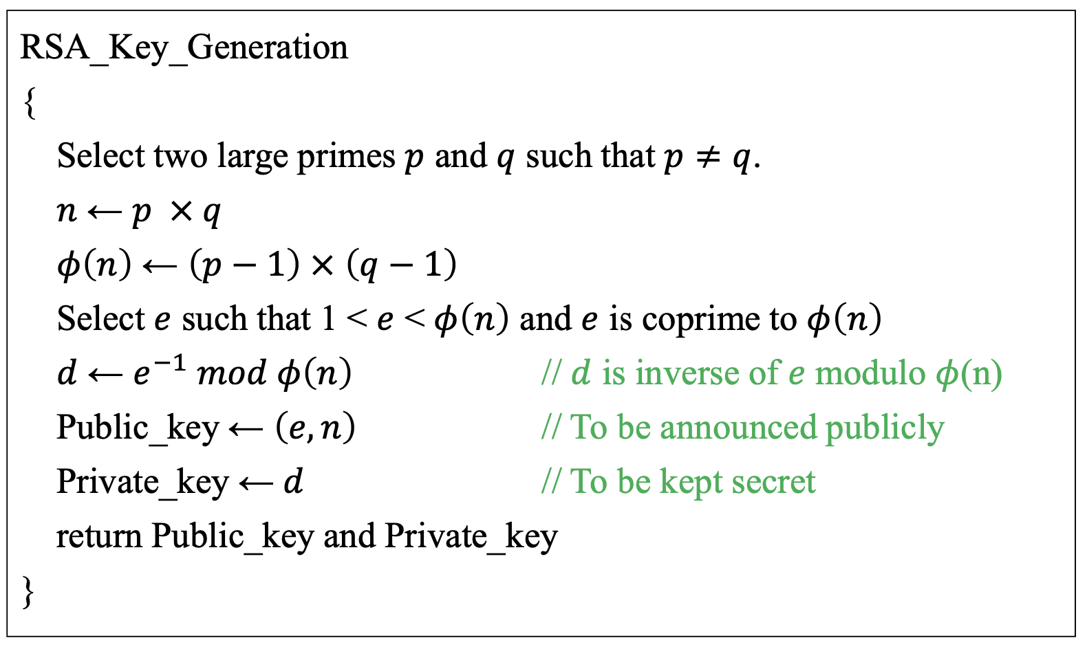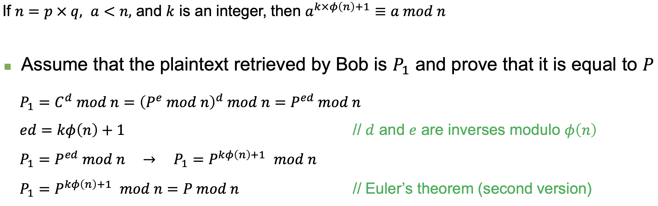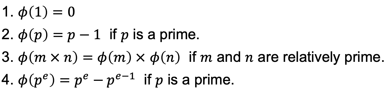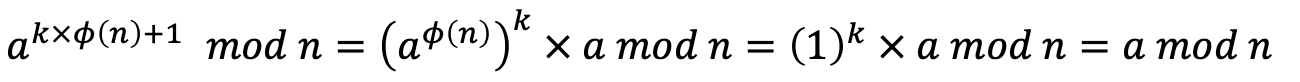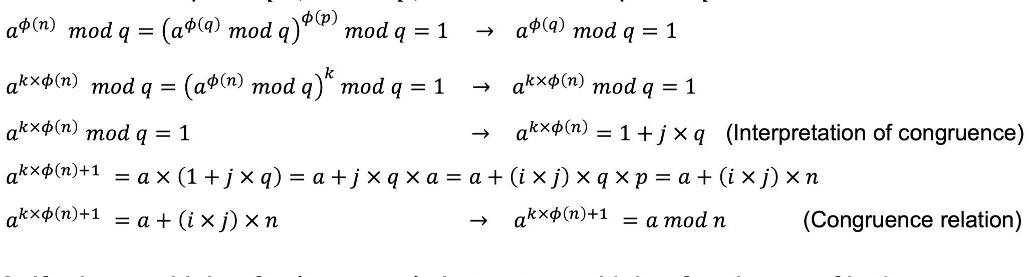 - If 𝑛 = 𝑝 × 𝑞, 𝑎 < 𝑛, and 𝑘 is an integer, then 𝑎k×ϕ(n)+1 ≡ 𝑎 (𝑚𝑜𝑑 𝑛)