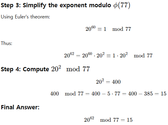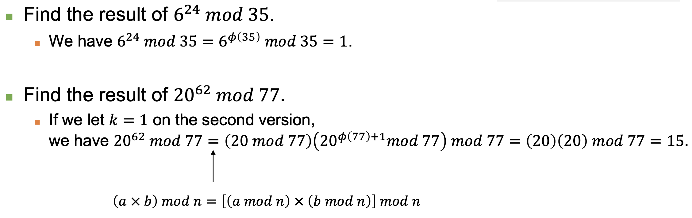 - Euler’s theorem sometimes is helpful for quickly finding a solution to some exponentiations.