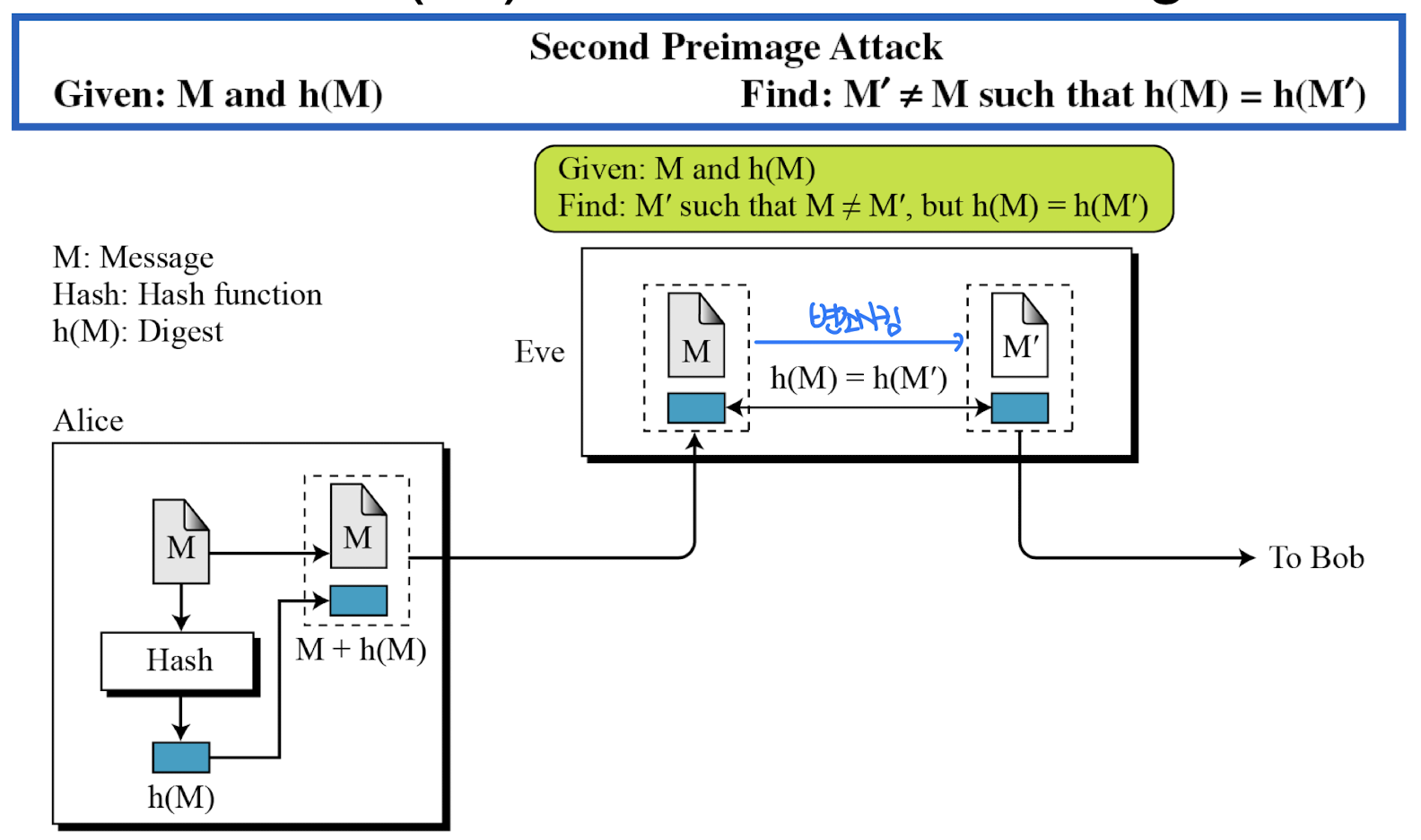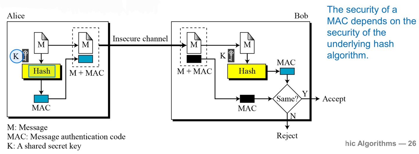 - The difference between an MDC and a MAC is that MAC includes a secret between Alice and Bob.