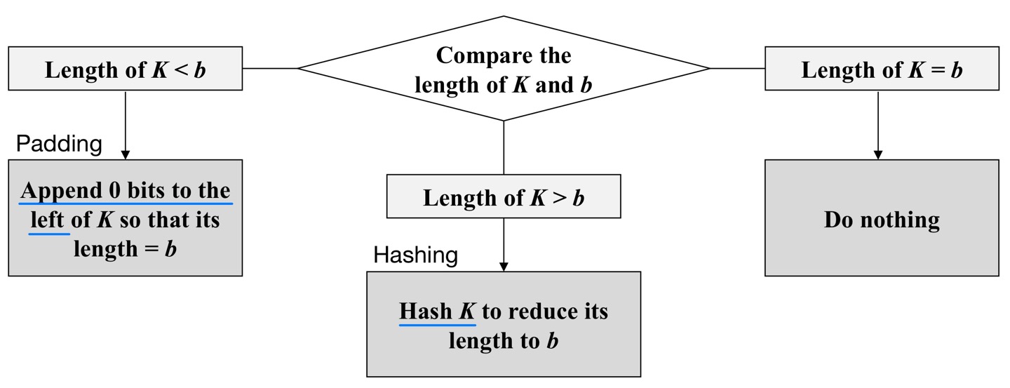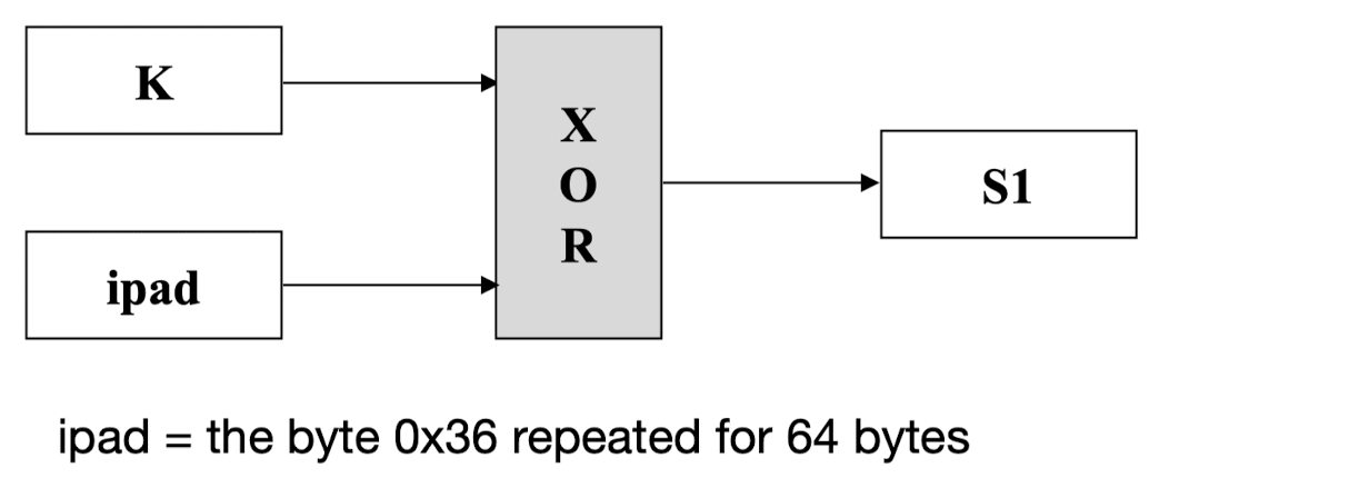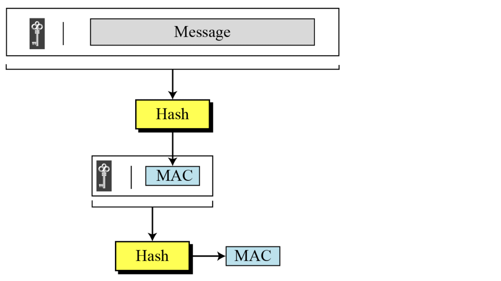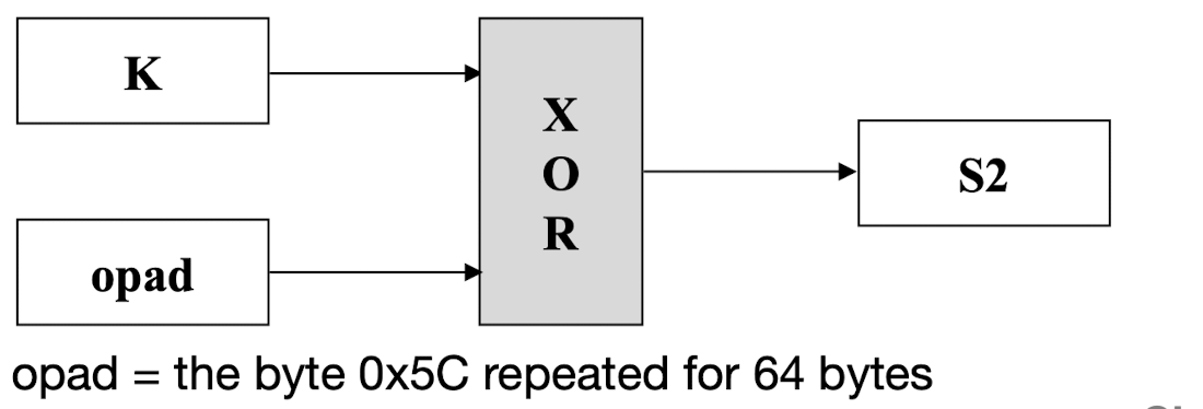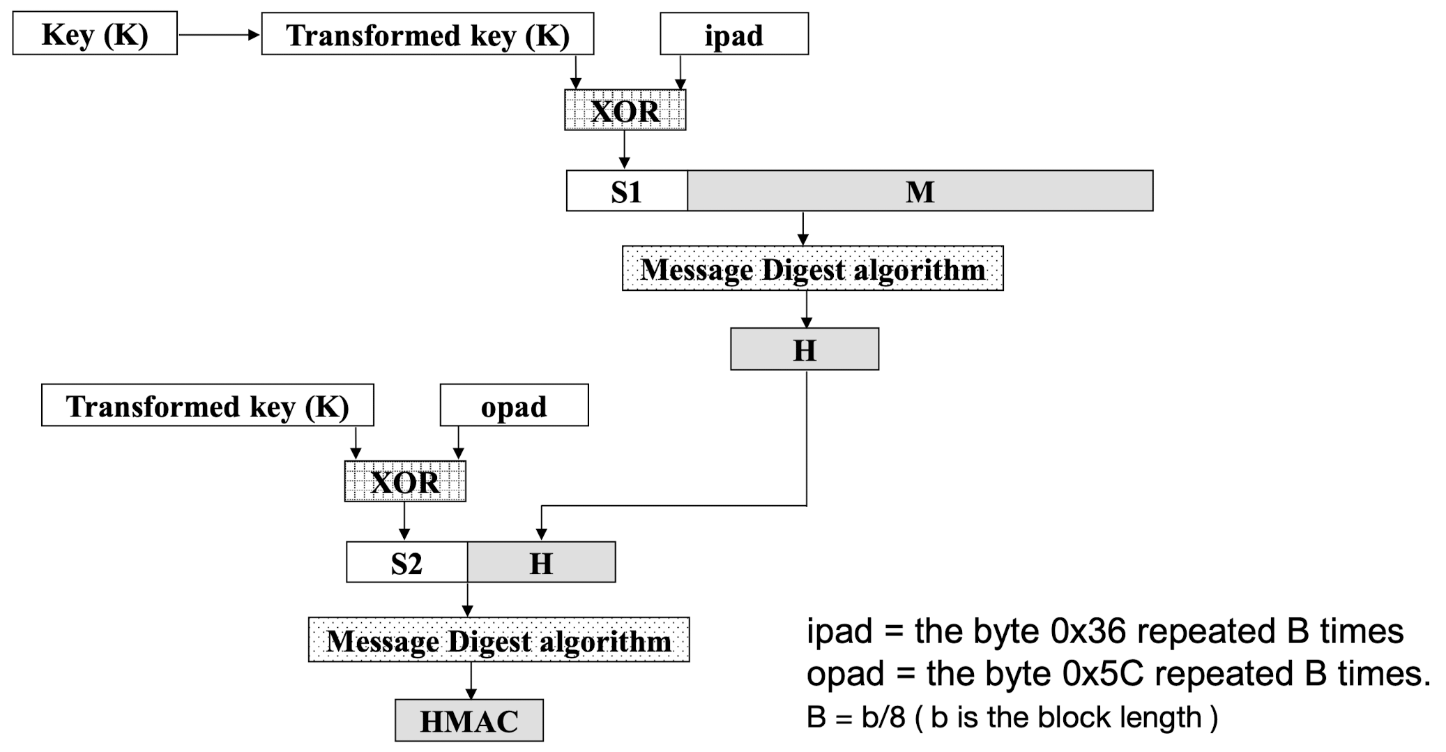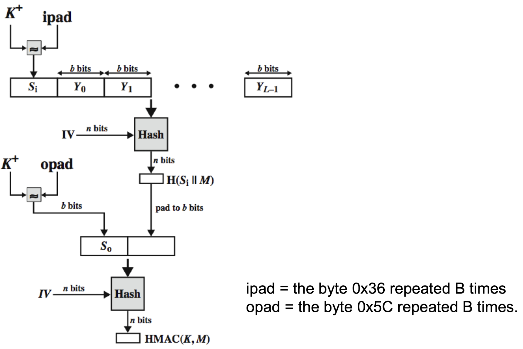 HMACK(M)= Hash[(K+ XOR opad) || Hash[(K+ XOR ipad) || M)] ]