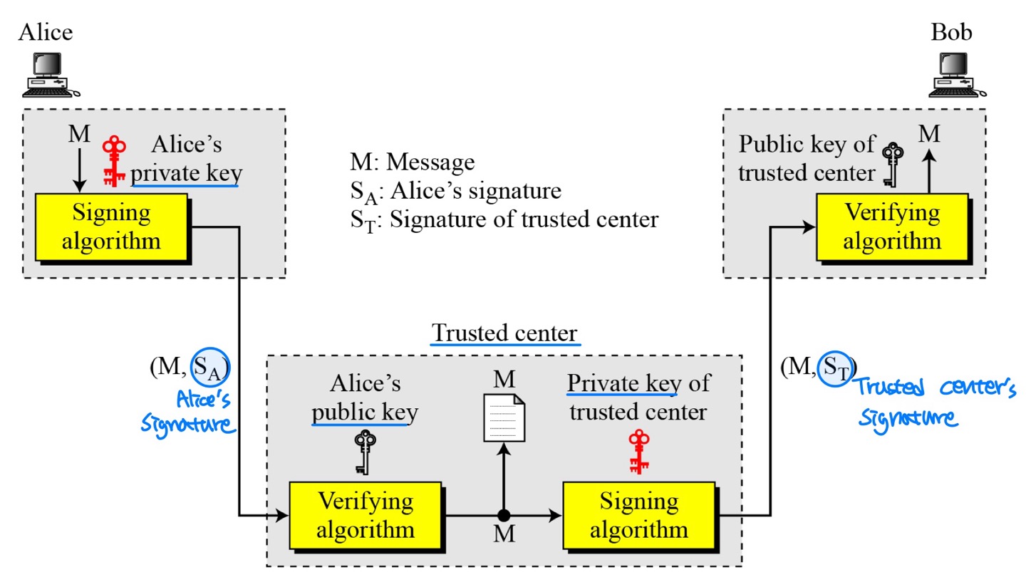 - Alice sends message to Bob with MAC, then Bob knows it is from Alice and the message is not modified. But Alice may deny sending the message. No non-repudiation.