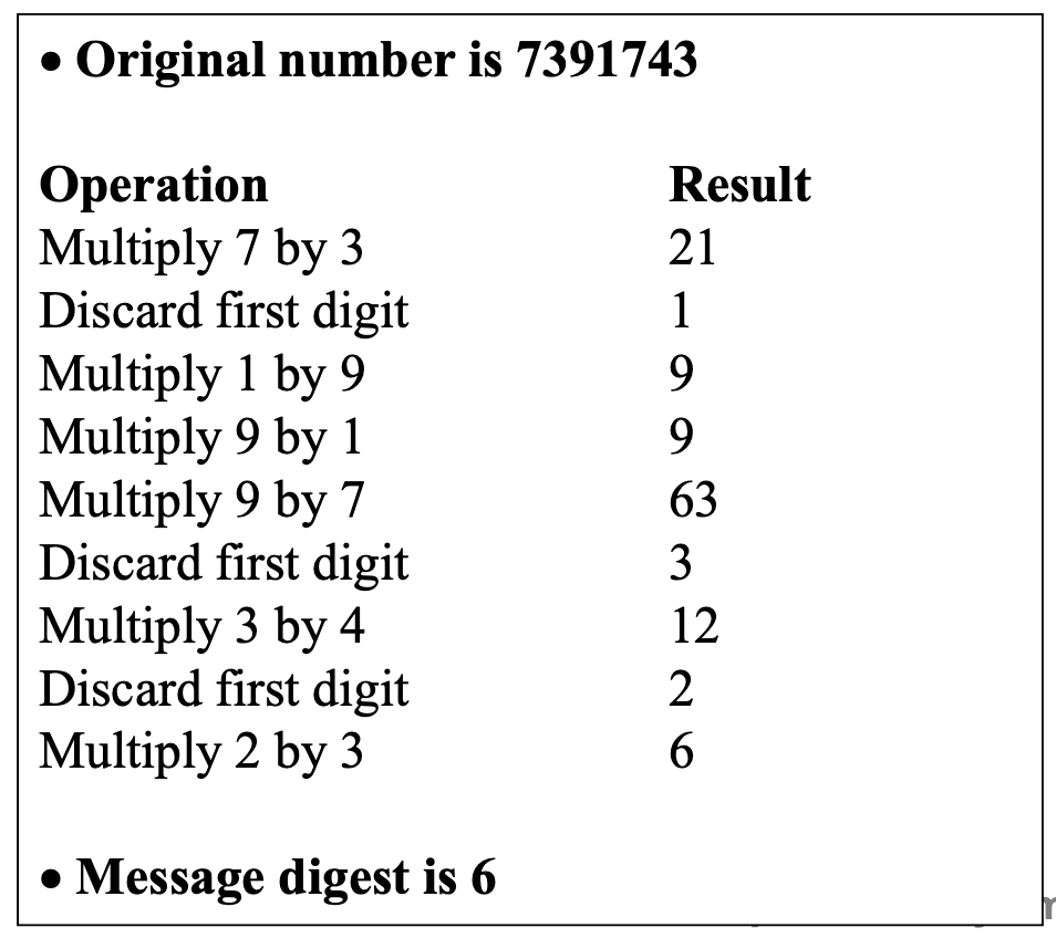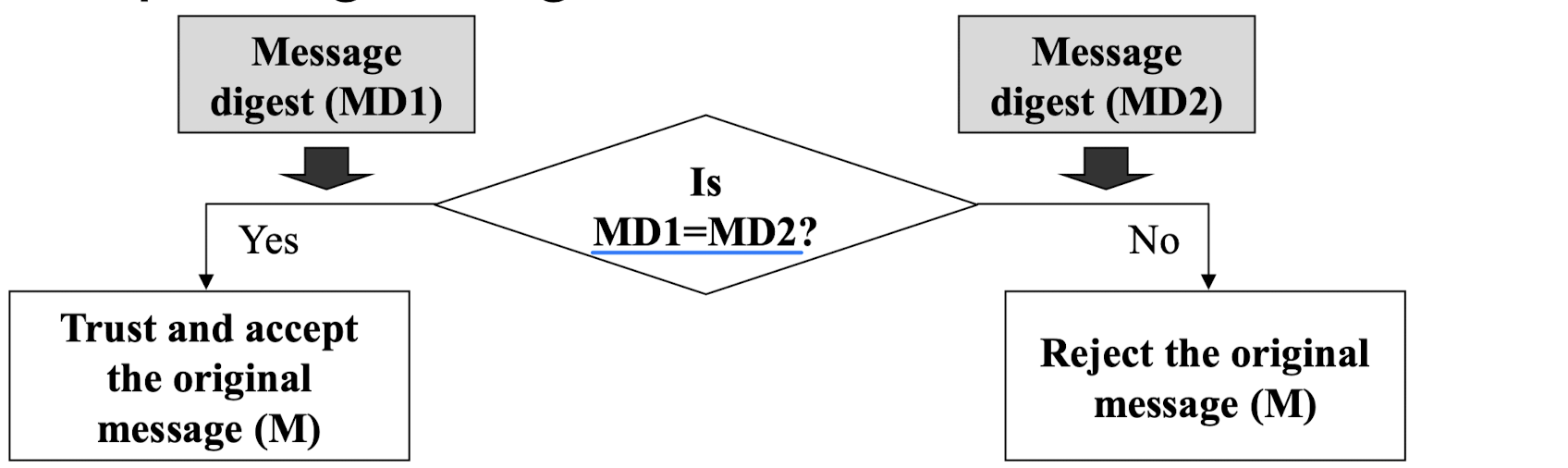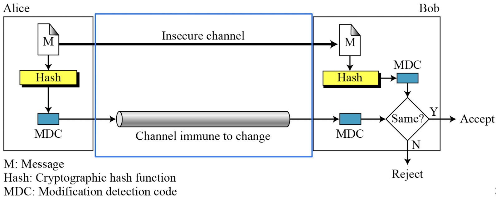 - If Alice needs to send a message to Bob and be sure that the message will not change during transmission, Alice can create a message digest, MDC, and send both the message and the MDC to Bob. Bob can create a new MDC from the message and compare the received MDC and the new MDC. If they are the same, the message has not been changed