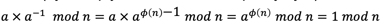 - If 𝑛 and 𝑎 are coprime, then 𝑎−1 𝑚𝑜𝑑 𝑛 = 𝑎ϕ(n)−1 𝑚𝑜𝑑 𝑛