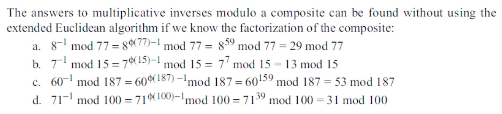 - Euler’s theorem can be used to find multiplicative inverses modulo a prime; Euler’s theorem can be used to find multiplicative inverses modulo a composite.