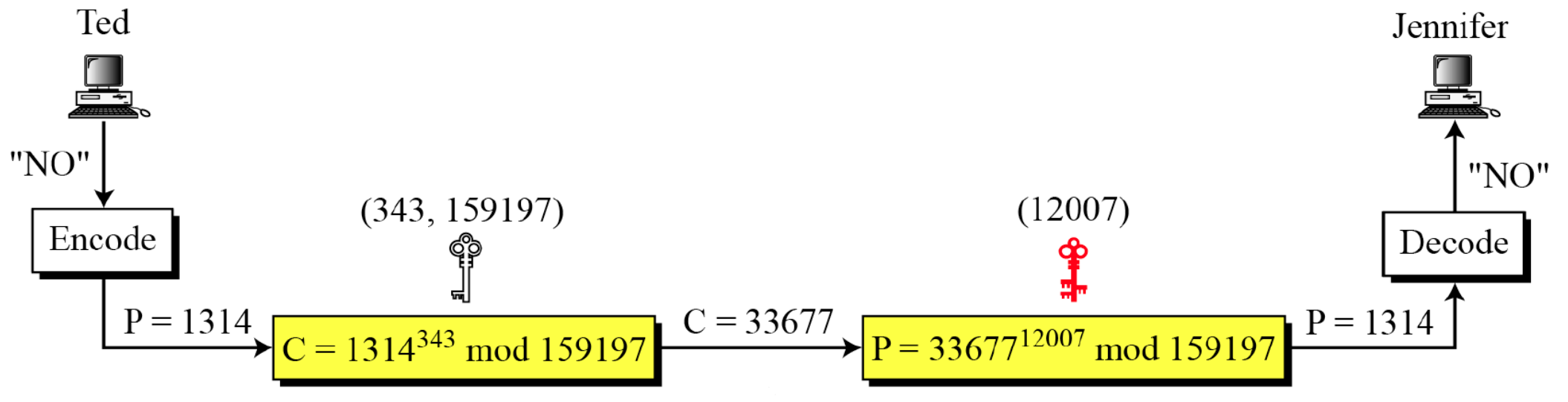 - Jennifer creates a pair of keys for herself. She chooses 𝑝 = 397 and 𝑞 = 401. She calculates 𝑛 = 159197. She then calculates 𝜙(𝑛) = 158400. She then chooses 𝑒 = 343 and 𝑑 = 12007. Show how Ted can send a message to Jennifer if he knows 𝑒 and 𝑛.