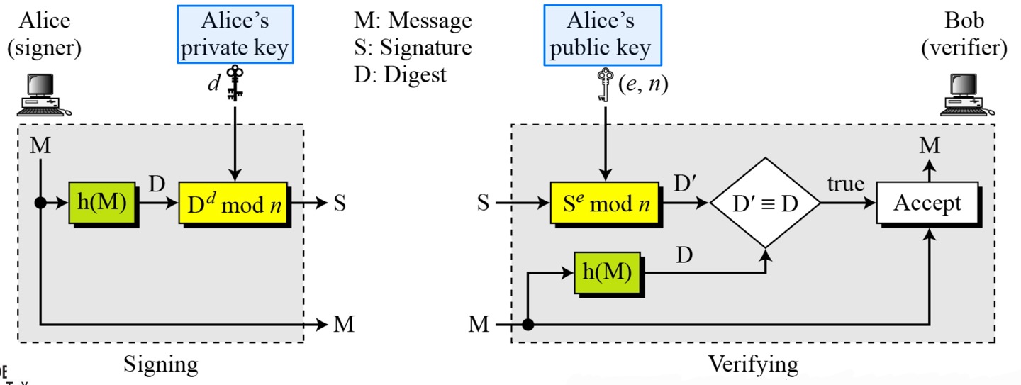 - In the RSA digital signature scheme, 𝑑 is private; 𝑒 and 𝑛 are public.