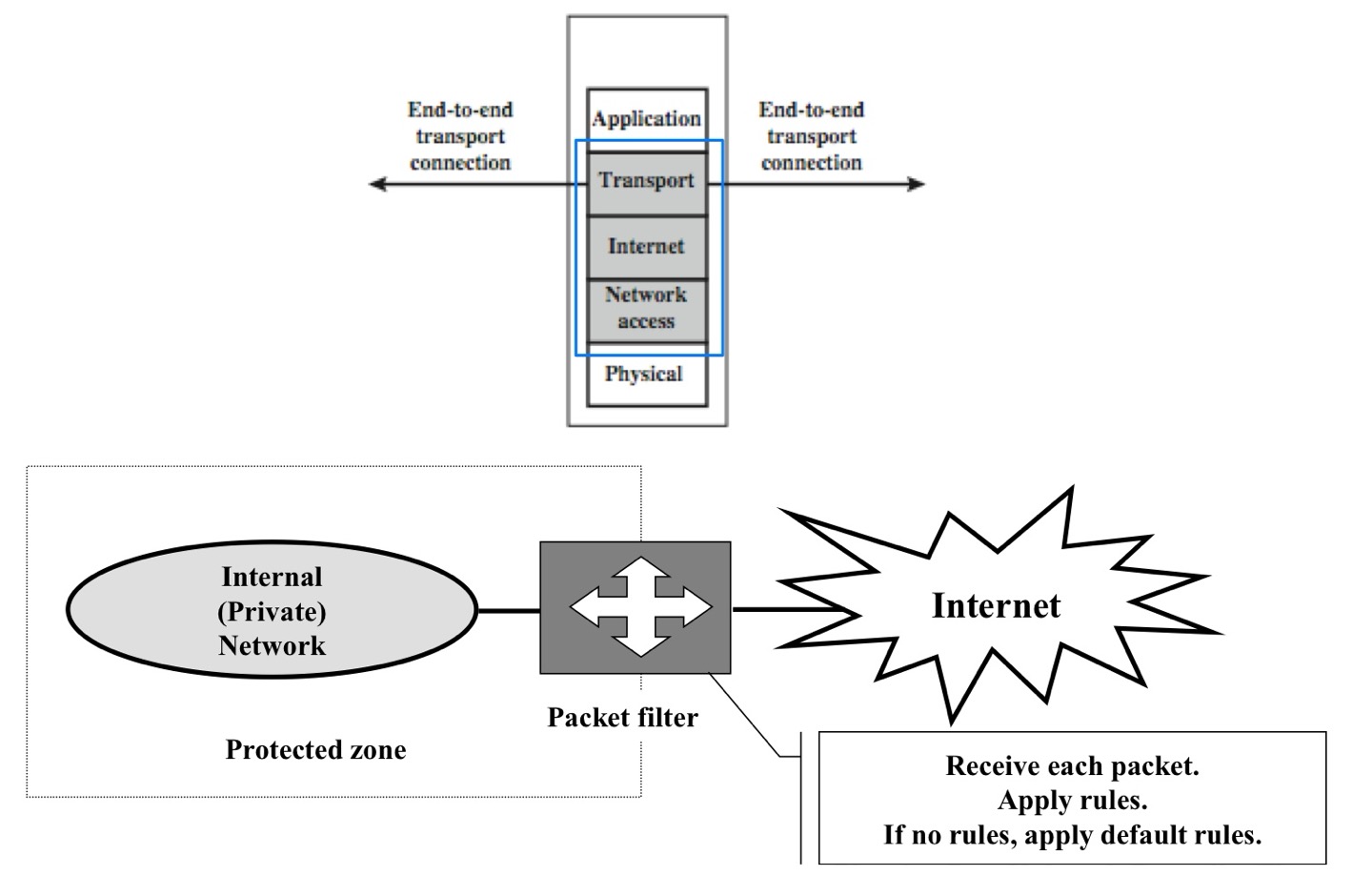 - Forward and block packets based on information in the network layer and transport layer headers, such as source and destination IP addresses, source and destination port numbers (TCP or UDP), and type of protocol (IP)