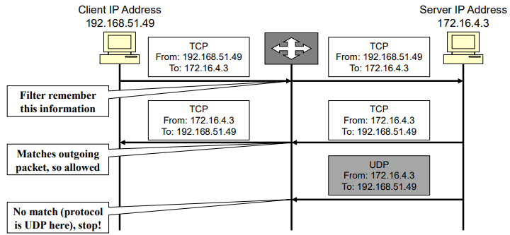 - Allow incoming TCP packets only if they are responses to the outgoing TCP packets that have gone through out network