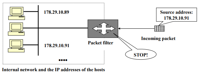 - An intruder attempts to send a packet towards the internal network, with the source IP address set equal to one of the IP addresses of the internal users.