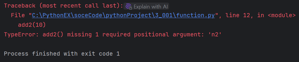 # 매개변수와 인수가 동일하지 않은 경우 def add(n1,n2): print(n1 + n2) add(10)