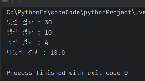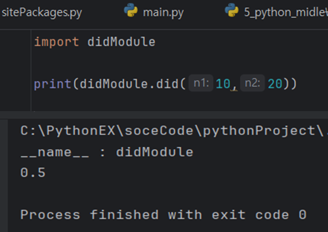 def add(n1, n2): print(f"덧셈 결과 : {n1 + n2}") def sub(n1, n2): print(f"뺄셈 결과 : {n1 - n2}") def mul(n1, n2): print(f"곱셈 결과 : {n1 * n2}") def did(n1, n2): print(f"나눗셈 결과 : {n1 / n2}")