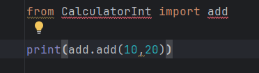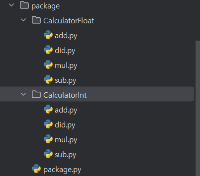 from CalculatorInt import add from CalculatorInt import sub from CalculatorInt import mul from CalculatorInt import did print(add.add(10,20)) print(sub.sub(10,20)) print(mul.mul(10,20)) print(did.did(10,20)) from CalculatorFloat import add from CalculatorFloat import sub from CalculatorFloat import mul from CalculatorFloat import did print(add.add(10,20)) print(sub.sub(10,20)) print(mul.mul(10,20)) print(did.did(10,20))